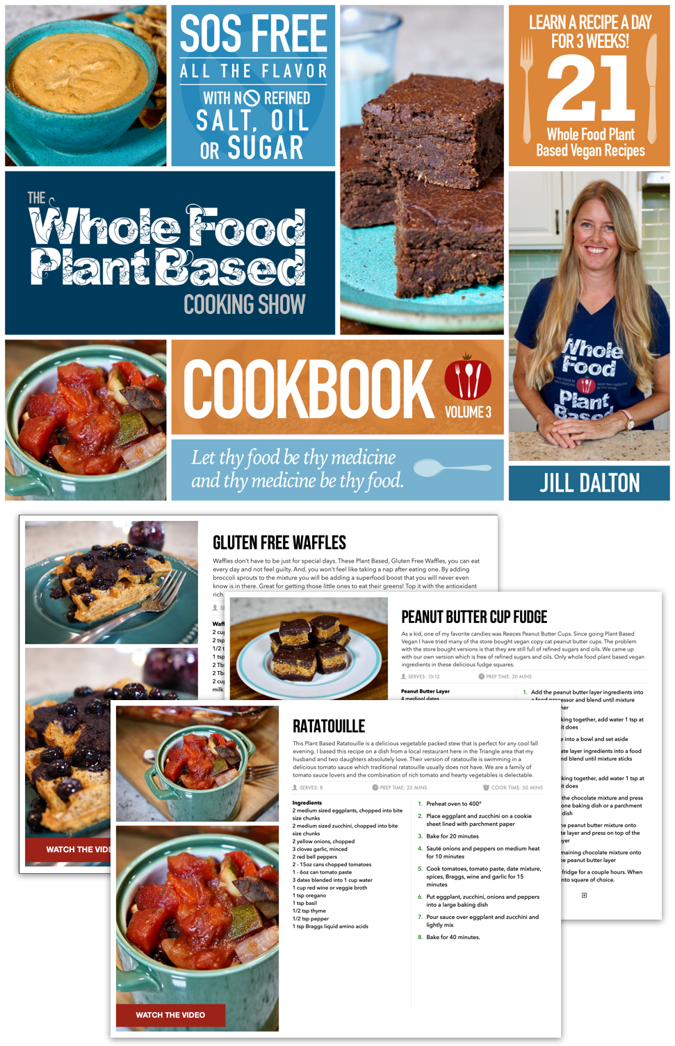 There are a total of 21 recipes in the cookbook including: Lentil Flatbread, Tomato Basil Hummus, Zucchini Wraps, Cream Cheese, Caramel Apple Cake, Chocolate Brownies, Coffee Smoothie, Peanut Butter Cup Fudge, Peanut Butter Oatmeal Sandwich Cookies, Broccoli Cheese Casserole, Pancakes, Potato Leek Soup, Ratatouille, Chili, Waffles, Moussaka, Black Bean Soup, Blue Cheese Dressing, Honey Mustard Dressing, Italian Dressing, Nacho Cheese Sauce.
